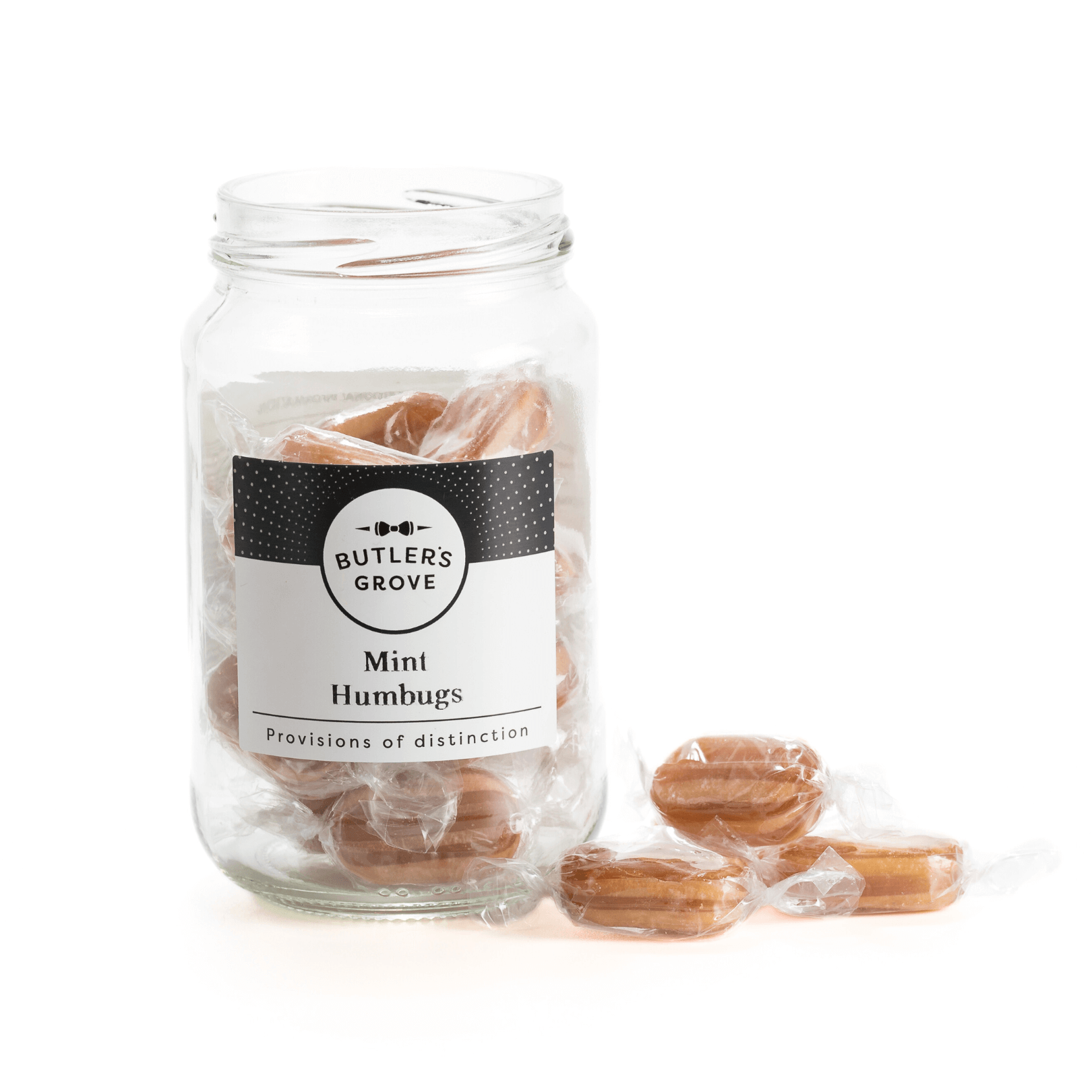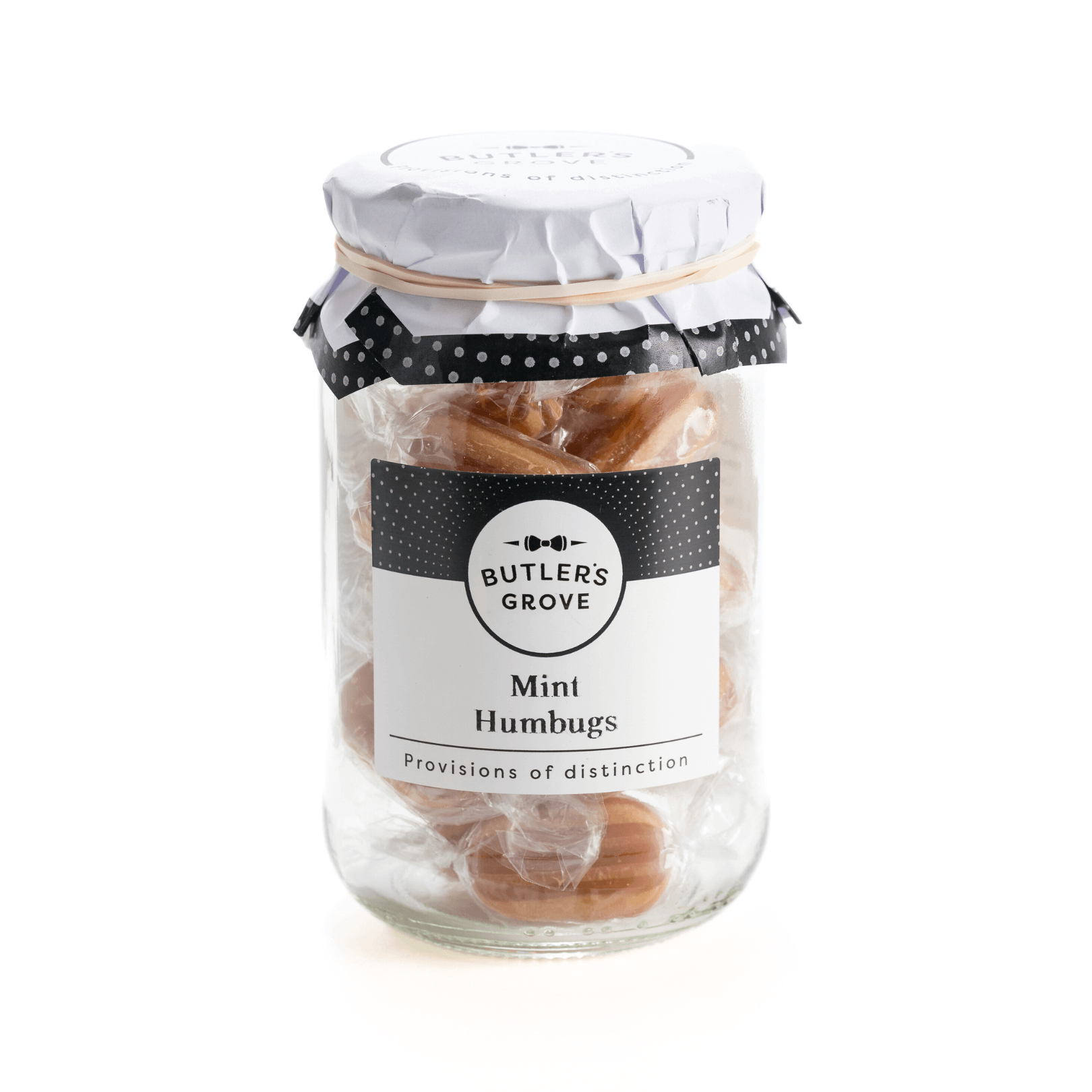 Savour the classic taste of our Mint Humbugs - traditional hard-boiled sweets with a crisp peppermint flavour and a smooth, buttery toffee centre. Each humbug is carefully crafted for a satisfying crunch followed by a mellow, creamy finish, offering a perfectly balanced and nostalgic treat. Beautifully presented in a charming, reusable glass jar, these sweets make a thoughtful gift or a comforting indulgence for yourself. Ideal for sharing, gifting, or enjoying as a refreshing pick-me-up, our Mint Humbugs bring a timeless touch of British confectionery to any occasion.