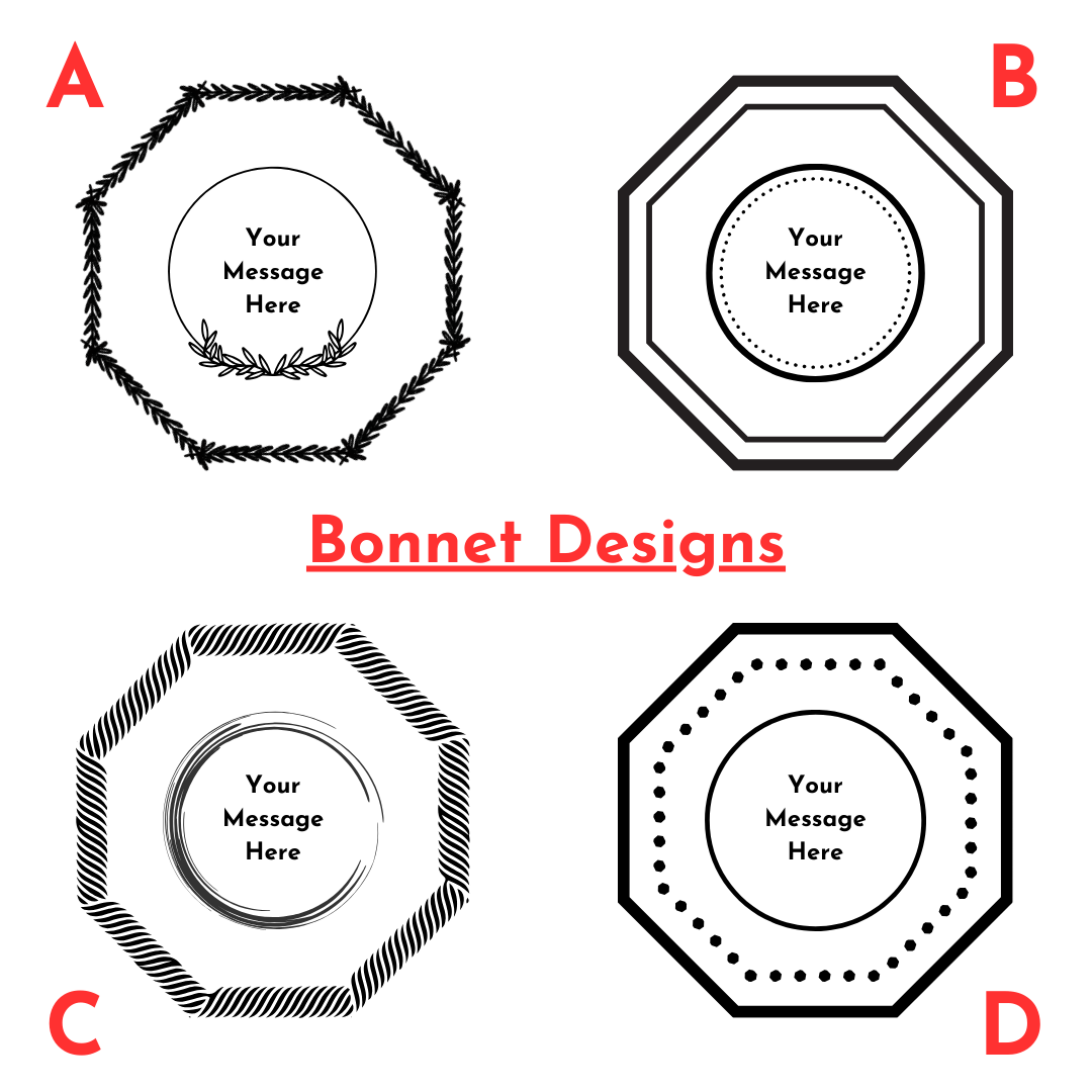 Simply select the personalisation option above, let us know what you'd like writing on each section and select which bonnet design you'd like, then we'll do the rest!